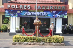 PASURUAN,Kabar99news.com,– Polres Pasuruan menggelar apel Operasi Zebra Semeru 2024, yang dipimpin langsung oleh Kapolres Pasuruan, AKBP Teddy Chandra, S.I.K., M.Si. Acara ini berlangsung di lapangan Mako Polres Pasuruan pada Senin (14/10/2024).