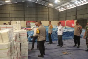 Kapolres Mojokerto bersama jajarannya langsung menginspeksi kondisi gudang logistik KPU, memeriksa kesiapan distribusi perlengkapan pemungutan suara, dan memastikan keamanan kantor KPU sebagai pusat kegiatan Pemilu di wilayah Mojokerto.